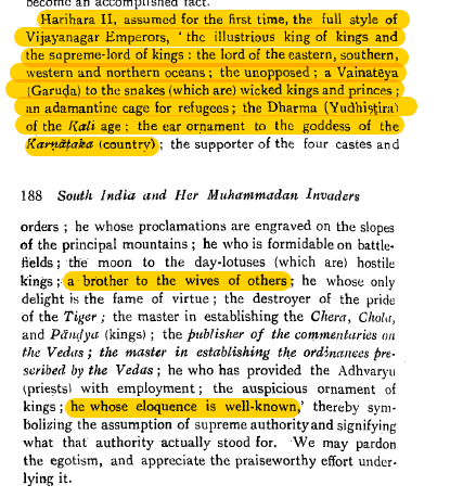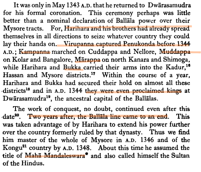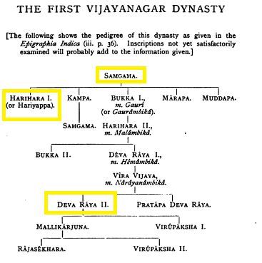 “The kings of Vijayanagar, Harihara I and Bukka I of the Sangama dynsastry, claim to be Candravamsa Ksatriyas-Ksatriyas of the lunar race; they, therefore were justified in assuming the title of mahaamandalesvara from the beginning of their independent rule.” [13, 90]