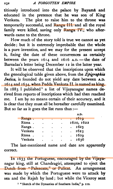 However, what he won on the battlefield he would eventually lose in palace politics and harem intrigues. Like other Hindu Emperors of his time he had many wives (6) and concubines, who gave him only daughters. Among his principal ones was the favourite, who failed to bear him an heir, and so like many of her lot adopted one as natural born. Out of ill-advised romantic sentiment Venkatapathi indulged her claim for as long as he was hearty and hale; however, on his deathbed he would proclaim next of kin and his successor rather than this namesake “son”. On his passing, the relatives of this noblewoman (Gobburis) then stake their proxy rule on the claim of this puppet adoptee. The resulting internecine warfare (and brutal bloodshed) would further gut the already rump state of Vijayanagara. The Gobburi Chiefs here recalled the Thirumala brothers of the Thuluva era in their greed for power even amidst civilizational destruction.