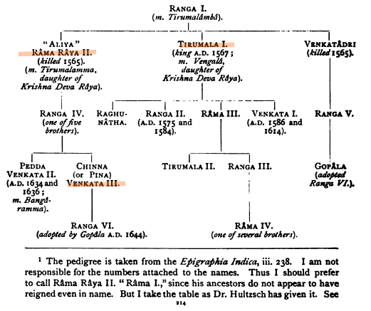 Thirumala was then followed successively by Ranga II (his second son), then Venkata I, who ruled from 1586-1614 CE. [sewell, 218] He is better known to us today as Venkatapathi Deva Raaya.
