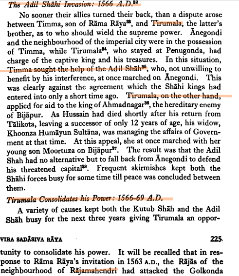 What’s worse, in her desperation to save her son’s life, Varadambika sent a letter to Adil Shah, asking him to save her son in return for favourable financial terms to him. Adil Shah only sought to increase his wealth and did so by camping his army before the walls of the City. Disgusted by this, the nobility switched sides to Aliya Raama, and collectively they defeated and drove away Adil Shah. [9, 181] However, within a few years, the same episode repeated when Araveedu Raama was away. The Thirumala brothers then took advantage and re-invited Ibrahim Adil Shah to vouchsafe the throne of Venkatadri. Seeing the situation turn adverse Araveedu bided his time and sent messages asking the Thirumalas to send away Ibrahim so as to prevent Adil Shahi rule and oppression to the masses. Temporarily seeing the light and satisfied by promises of allegiance, the elder Thirumala paid off Adil Shah and sent him away.