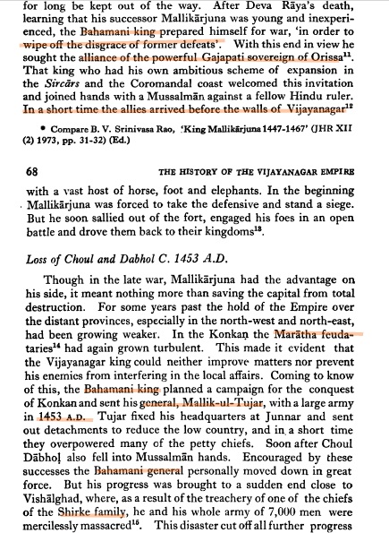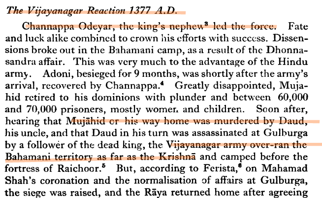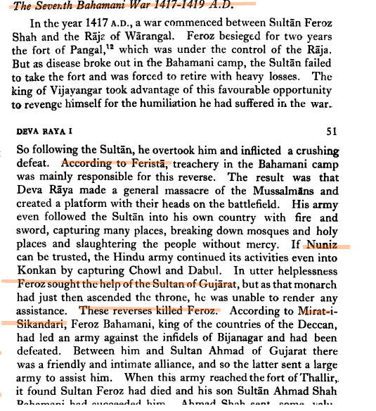 The War of Succession would invite Bahmani rapacity for a Sixth War. As usual Ferishta seeks to trump up a provocation citing some apocryphal story over a girl and her family escaping into Bahmani territory, with a Vijayanagara detachment on their heels. Ferishta then proclaims a third siege of Vijayanagar. Though it was unsuccessful, the usual atrocities are committed by detachments of the sultan’s army. Casualties are said to have reached 50,000, upon which Deva Raya I asks for terms. It is here that both Ferishta and so-called “traditional scholars” injure both the truth and the native cause. Alone in falsely claiming that a Deva Raya I’s daughter was sent, Ferishta’s untruths are today amplified by modern day distorians.  If an event occurs, it should be admitted however humiliating, but facts must be corroborated not blindly swallowed from hostile sources accused by Hindu and British historians alike as prevaricator and exaggerator. Moreover, P.R. Rao  notes that Nicolo conti (present during Deva Raya I, did not mention any princess like Ferishta). [3, 106] This claim may then be safely set aside until either side might bring better evidence.