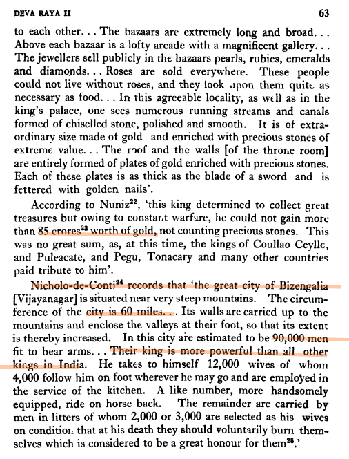 The Third Portuguese Embassy cemented the Alliance with Vijayanagara. From then on, the supply of horses would flow in, and the piratical portuguese would flow out to hit the foreign invader turkics (ensconced for barely 2 centuries). They would also come in handy at the Battle of Raichoor. His run of victories include the 1st Bijapur War, the 1st and 2nd Golkonda Wars, 2nd Bijapur, with the 3rd and 4th resulting in Kulbarga’s destruction, a Southern Rebellion, 3rd Golkonda, but above all, the signal victory over the treasonously competitive Gajapathis in the Odia War.  Adil Shah sent as many as 3 embassies after his defeat, each one more submissive than the next. There was even the famous episode where KDR demanded Adil Shah pay personal submission. Though the latter agreed, he never showed up.  So powerful had he become that the other 4 Shahi kings, who rooted for the humiliation of their arrogant Bijapuri rival now feared for their own lands. Due to poor supply of water KDR could not drive into their lands in response to their veiled threats. For logistical reasons, he pulled back. It should also be noted that during KDR’s reign itself, there were some minor conflicts with the Portuguese. Though they soon patched up, it was a sign of things to come.