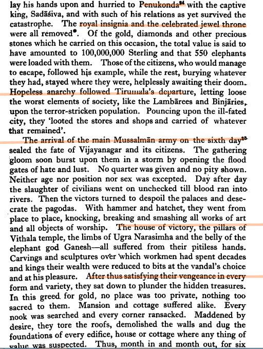 The Destruction that followed the taking of Vijayanagara was exceeded only by the pusillanimity of the dynasty that failed to even afford it a token defence. Unlike the Byzantine Emperor Constantine XI who gave the City a grand farewell,  the fall of Vidyanagari was not even worthy of song. Indeed, the rapine and ferocity with which it was destroyed and denuded was only exceeded by the bovine response of aristocrat and inhabitant alike to the impending doom. It did not take place all at once, but there is such a thing as reading the room. Panic did not take place until it was too late. Having destroyed the city with their ambition the remaining 3 Araveedu brothers then amscrayed for Penukonda—taking with them the nominal Raaya.