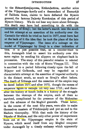 Successor states include the aforementioned as well as the Nayaks Kings of Thanjavur, Jinji, Ikkeri, and Kandy. The true successor however, was one that did not owe direct allegiance but was moulded in its image: the Maratha Empire. Chh.Shivaji issued coinage on the model of Vijayanagara. Sriranga III d.1677. King lists end 1710CE. Some assert that Sriranga III was in fact the IV. Here is an alternate listing: