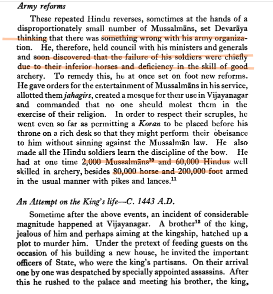 “Among the kings of Vijayanagar, Devaraya was second only to Srikrishnadeva Raya. He was a brave commander and had the foresight to modernize and re-organise his army to meet the threats from the neighbours. On ascending the throne he examined the causes for the failure of the Vijayanagar army in their engagements with the Bahminis. He felt that artillery of the Vijayanagar forces was weak. So he took steps to improve this division. He improved cavalry also by recruiting Muslim archers and importing horses from West Asia. Unlike many Indian rulers, he did not neglect the Navy. His admiral Lakkanna could launch a successful expedition on Sri Lanka.” [3, 107]
