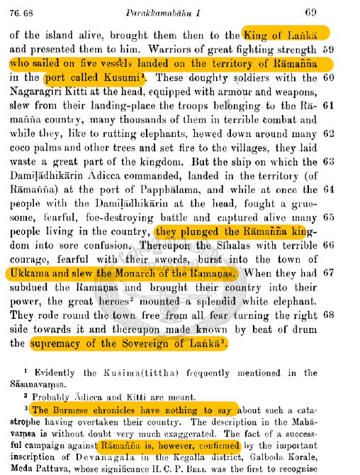 The 3 great kings of the Sinhalas were Devanampiya Tissa, Duttagaamini, and greatest of all, Paraakramabaahu I. True to his name, Paraakramabaahu led a valorous life, first quelling rebellions in Sri Lanka, before coming to the aid of the Pandya king against the Cholas. He rounded out this successful campaign by defeating the king of Burma (kingdom of Raamanna/Pegu), marking the high-water mark of Sinhalese imperialism. The Siamese (Samindas) are also mentioned. So notable was his reign that there are multiple chapters about him in the Choolavamsa.